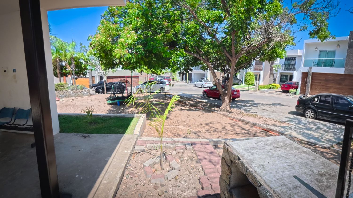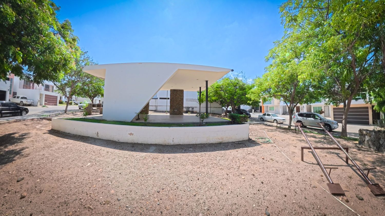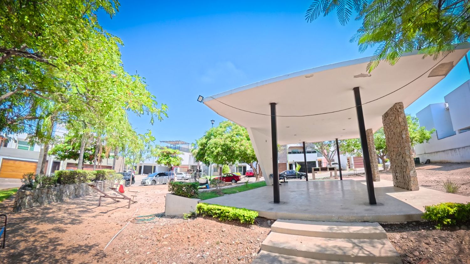 A dos cuadras de la casa, el área común del fraccionamiento es donde la vida comunitaria cobra sentido: árboles que dan sombra natural, palapa moderna con asador de piedra para reuniones, bancas bajo la sombra, y espacio amplio donde los niños corren, juegan, y se hacen amigos sin que tengas que preocuparte. Fraccionamiento cerrado con vigilancia 24/7, y esa tranquilidad de saber que tus hijos pueden salir a la calle porque solo entran vecinos que todos conocen. Aquí se crean las amistades de infancia que duran toda la vida.